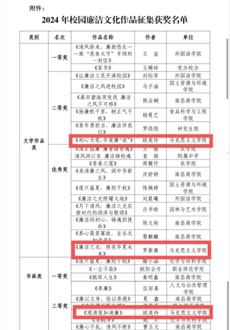 在学校组织开展“清风润江农 献礼颂国庆”为主题的廉洁文化作品征集活动文学作品中,欧美玲撰写的《初心为笔,作爱廉“说”》(指导老师:邱晓辉)荣获二等奖,罗紫薇《廉洁之光,照亮华夏未来》荣获优秀奖。书画作品中,欧美玲的《观清莲知清廉》(指导老师:邱晓辉)荣获三等奖。