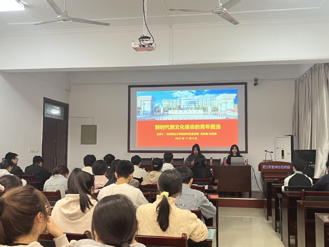 刘丹妮从如何理解新的文化使命、新时代条件下文化发展的重要特点两个方面展开宣讲。她重点阐述了新的文化使命的提出及其科学内涵和新时代条件下文化发展的五大特征,用通俗易懂的语言使同学们对新的文化使命有了进一步了解。左尚瑜结合自身及身边同学的社会实践经历,围绕青年担当新的文化使命的历史逻辑、现实逻辑及新时代青年践行新的文化使命的要求等方面,讲述青年应当如何担负起新的文化使命。她提出,践行新的文化使命要牢记牢牢把握意识形态方向盘,坚持内容为王的原则,用好新媒体,推动文化传承与创新。她号召,新时代青年要坚定文化自信、担负起新的文化使命,努力在推进中国式现代化进程中建设中华民族现代文明。