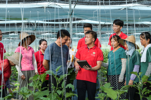 产业振兴是乡村振兴的重中之重。沂江乡东湖村作为市级乡村振兴示范村,其大棚蔬菜基地远近闻名。为深入了解该村产业发展情况,营队走进蔬菜大棚,听取基地负责人介绍产业规模、种植结构、产品销路等情况。队员朱伟在田间地头为大家讲解党的二十大报告关于农业农村工作的重要部署、2023年中央一号文件等精神,鼓励大家稳住面积、主攻单产、力争多产,为抓紧抓好粮食和重要农产品稳产保供贡献力量,把中国人的饭碗牢牢端在自己手里。