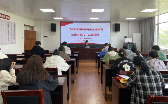 为进一步推进学习贯彻习近平新时代中国特色社会主义思想主题教育,4月26日下午,学院研究生党支部书记赵美岚围绕“如何深刻理解开展主题教育的重大意义”讲党课。全体研究生党员参加会议。