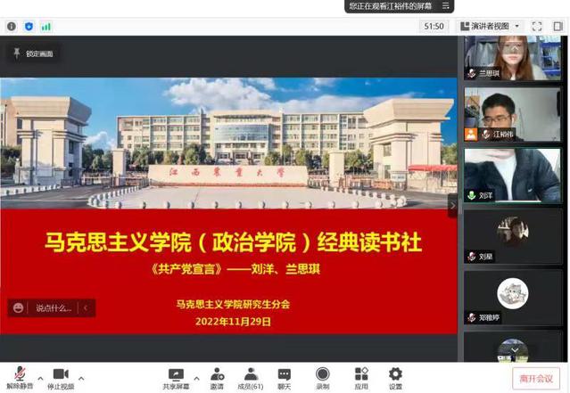 多读经典,品味经典。为营造书香马院浓郁氛围,11月29日下午,学院研究生经典读书社通过腾讯会议线上开展《共产党宣言》学习交流活动(第9期)。2021级研究生刘洋、兰思琪作学习交流,公司赵美岚老师出席指导活动并进行点评。分会学习部负责人江裕伟主持活动。