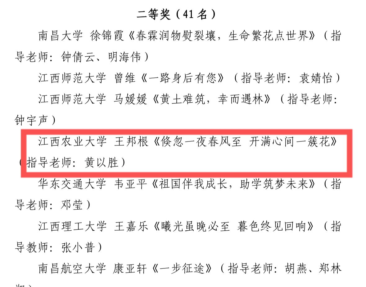 近期,在全省第五届“筑梦飞翔·资助伴我成长”主题征文活动中,学院研究生王邦根的《倏忽一夜春风至,开满心间一簇花》(指导老师:黄以胜)获二等奖。