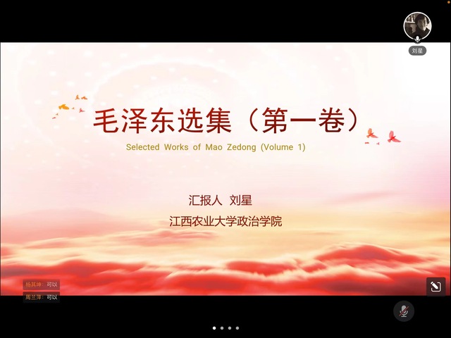 大家围绕主题展开了积极的互动交流。2021级研究生胡娇分享其对文章的理解,谈了毛泽东思想对马克思主义中国化的理论贡献。2021级研究生邓雨雨分析了《毛泽东选集》的重要作用,并就“实事求是”的精神和态度作了论述。2020级研究生黄健谈了分清敌友的重要性,提出“阶级划分时中国国情转变情况”的问题。