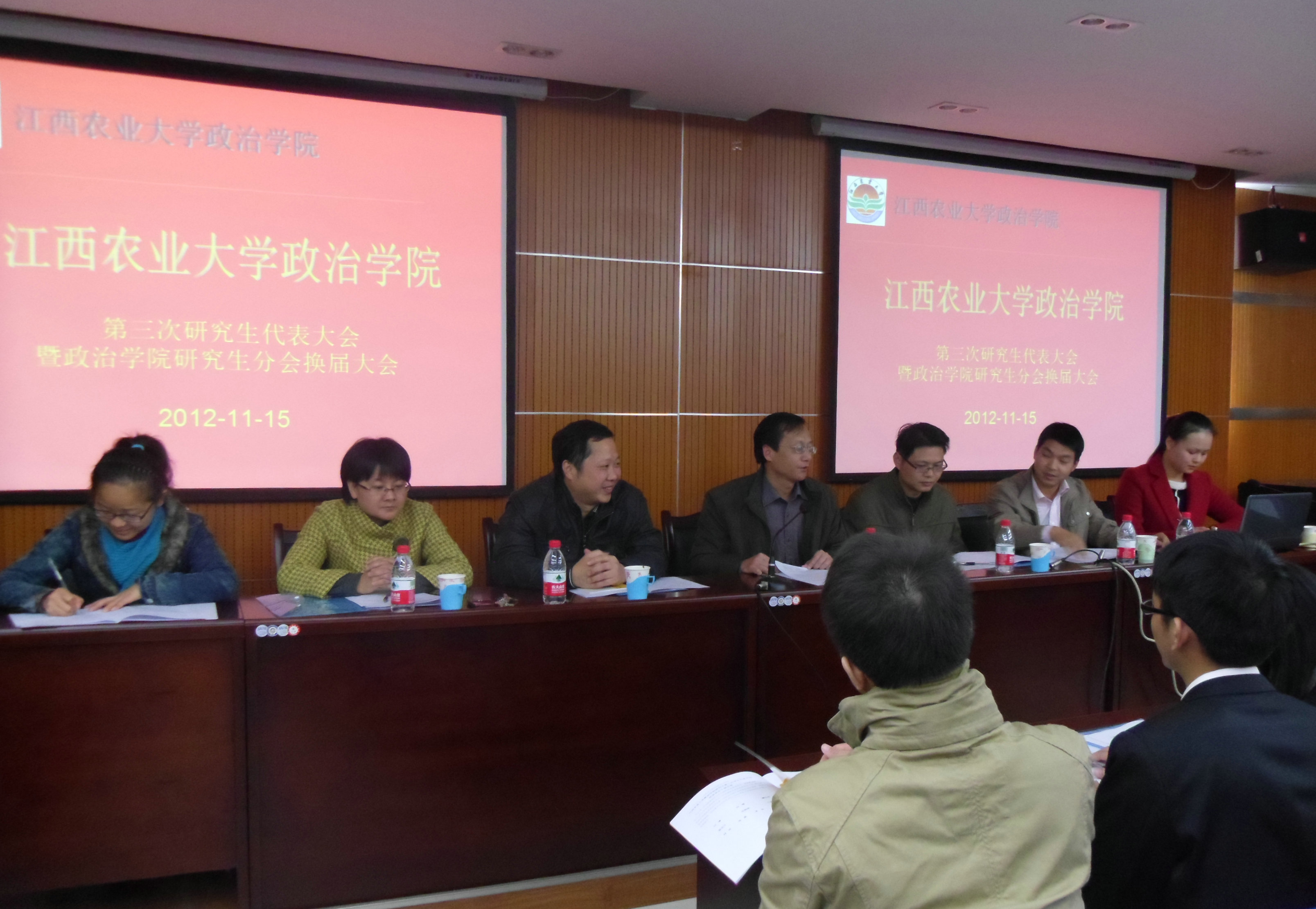11月15日下午,学院在109报告厅举行了政治学院研究生第三次代表大会。研究生党总支熊红华书记,研究生处团委陈小红,公司党总支书记、经理刘汉一教授,副经理姜木枝、付庆文,办公室主任吴全圣以及全体研究生出席了此次大会。