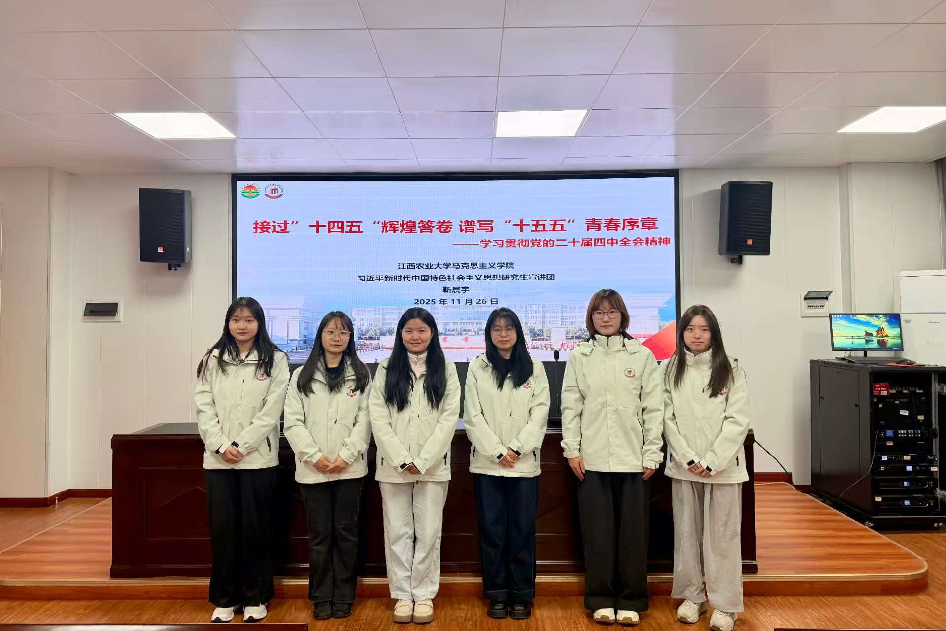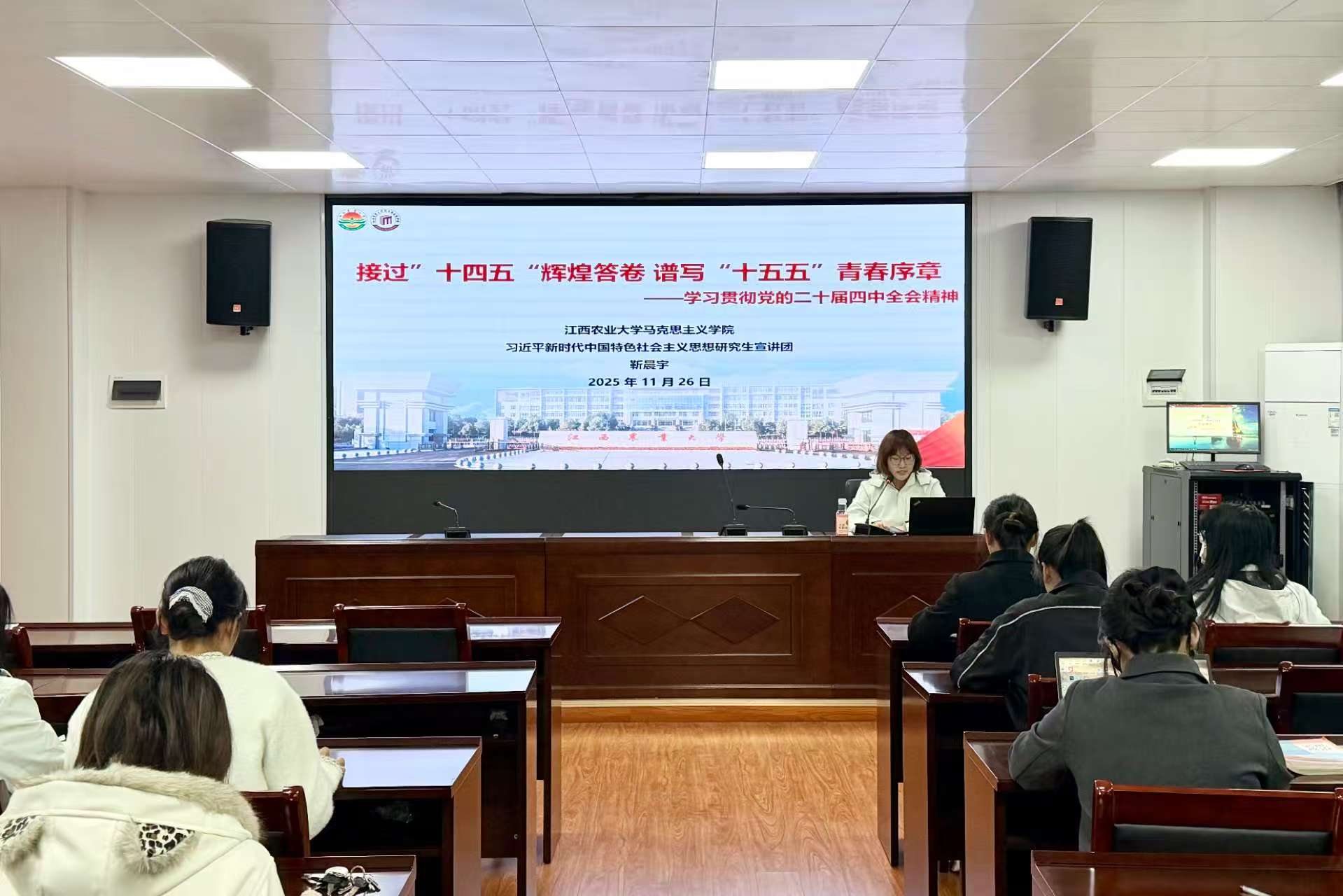 院研究生宣讲团成员靳晨宇以“回顾'十四五'辉煌成就,谱写'十五五'青春篇章”为题做了主旨宣讲。同学们共同回顾了国家在“十四五”时期取得的非凡成就与宝贵经验,深刻理解“十五五”时期国家发展的宏伟蓝图与战略部署。大家结合学校在服务地方经济社会发展、推动农业科技创新方面的生动实践与突出贡献,谈感想、说体会,表示要珍惜时代机遇、勇担历史使命,将个人成长融入国家发展大局。