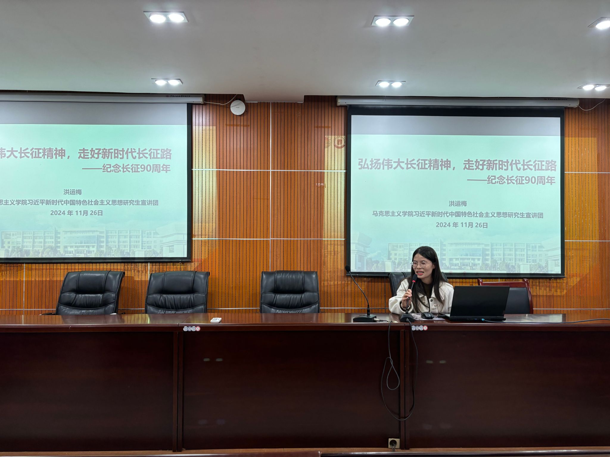 宣讲团成员洪运梅以《弘扬伟大长征精神,走好新时代长征路》为主题,通过鲜活的故事情节和翔实的数据,带领同学们回顾了长征的艰难历程和伟大胜利,深入剖析了长征精神的内涵,并结合身边事例号召大家在新时代的长征路上,继续发扬长征精神,勇于面对挑战,为实现中华民族伟大复兴贡献力量。