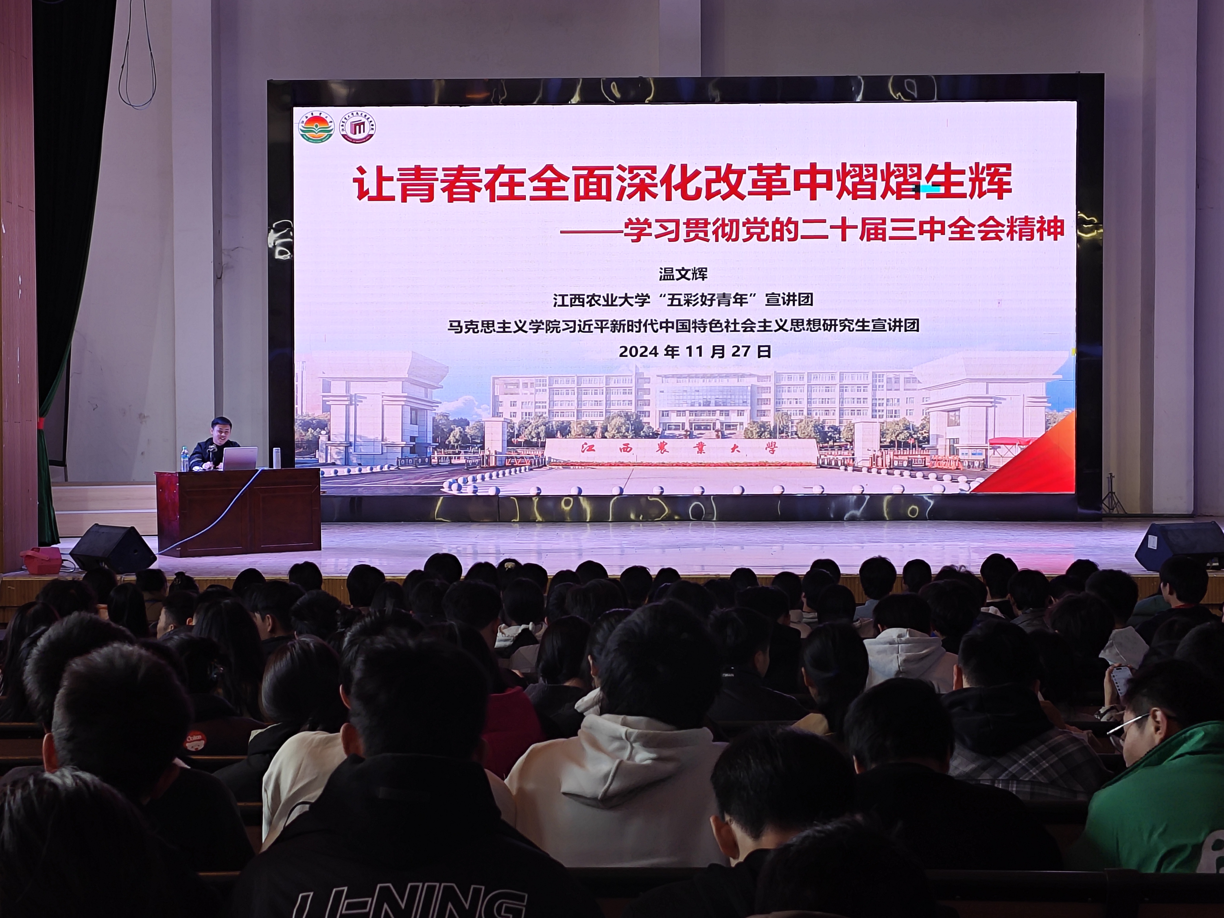为深入学习贯彻党的二十届三中全会精神,引导广大师生凝聚改革共识,11月27日下午,学校“五彩好青年”宣讲团、学院习近平新时代中国特色社会主义思想研究生宣讲团受邀赴江西技师学院宣讲党的二十届三中全会精神。宣讲团成员、2023级马克思主义中国化研究专业硕士研究生温文辉以“让青春在全面深化改革中熠熠生辉”为题作宣讲。该校500余名师生参加宣讲会。