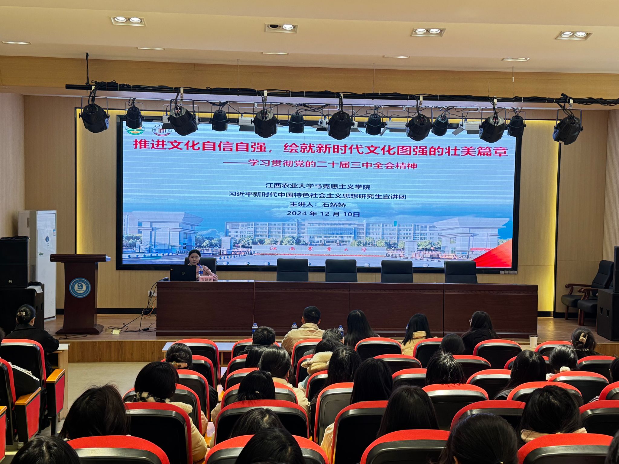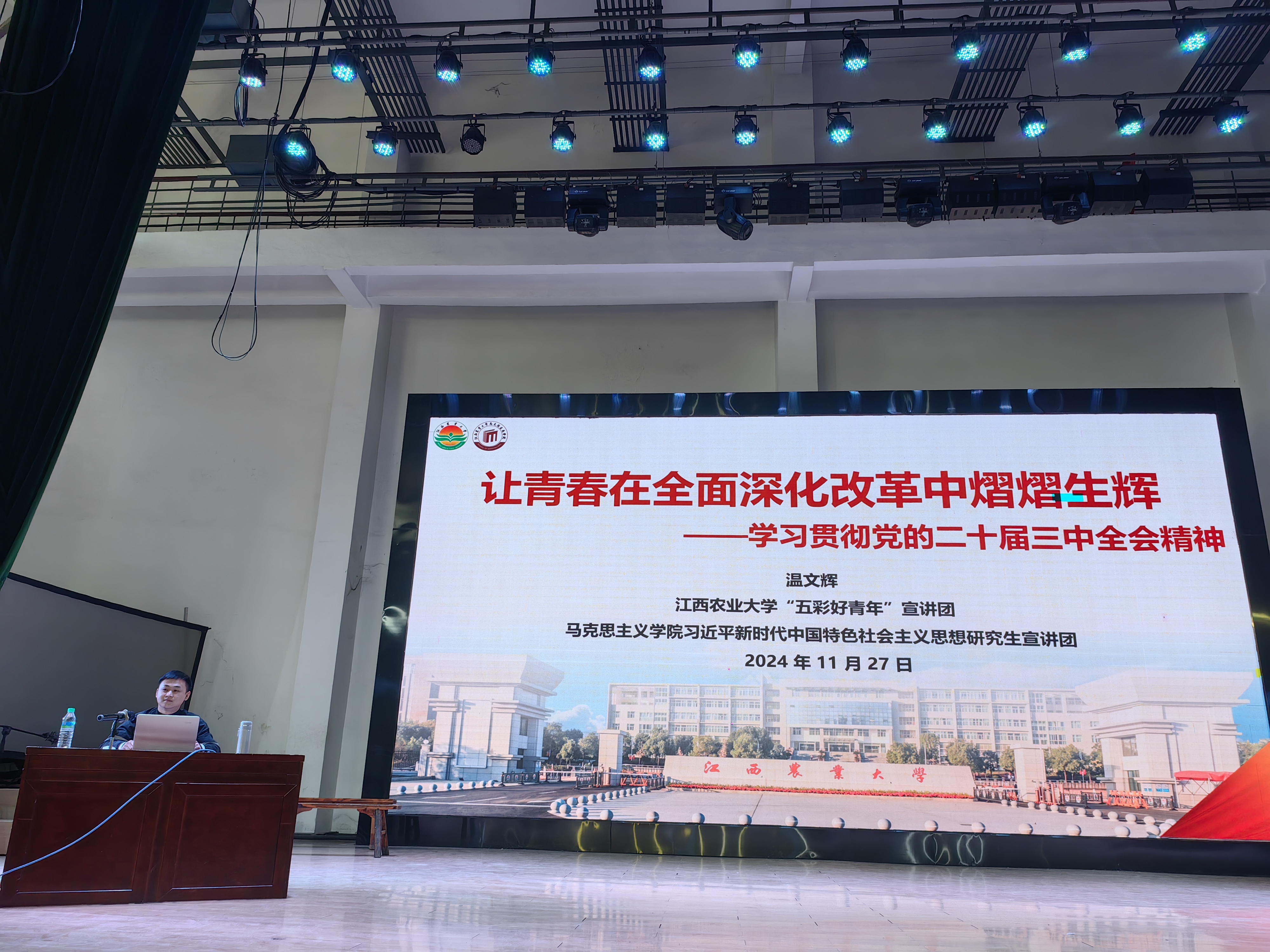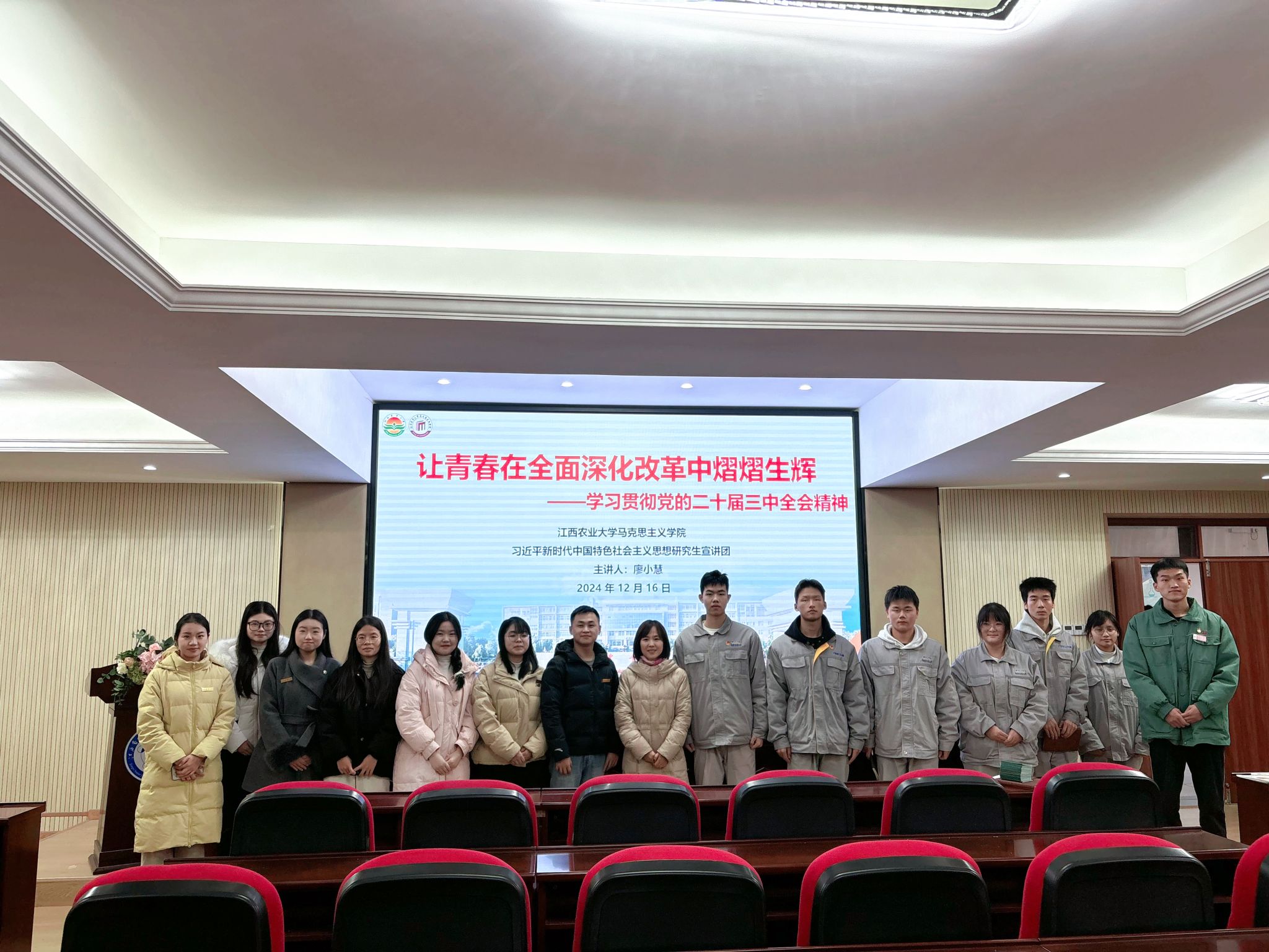 在学院的大力推广宣传下,宣讲团已累计开展党的二十届三中全会精神宣讲14场次,覆盖校内8个二级学院以及3所校外院校,听众近2000人次,涵盖员工党员、团员青年、员工干部等不同群体。在2026世界杯官网外国语学院,宣讲团成员杨茹然以“共绘中国式现代化青春画卷”为题面向本科新生作宣讲;在2026世界杯官网农学院,宣讲团成员廖小慧以“让青春在全面深化改革中熠熠生辉”为题面向员工干部作宣讲;在江西工业技工学校,宣讲团成员石娇娇以“推进文化自信自强,绘就新时代文化图强的壮美篇章”为题面向团员青年作宣讲。宣讲团通过与各学院团学组织、各员工社团交流合作,积极与校外院校对接,利用社交媒体、校园海报等多种渠道广泛宣传,不断拓宽受众范围,扩大影响力度,及时传递江农马院理论之声。
