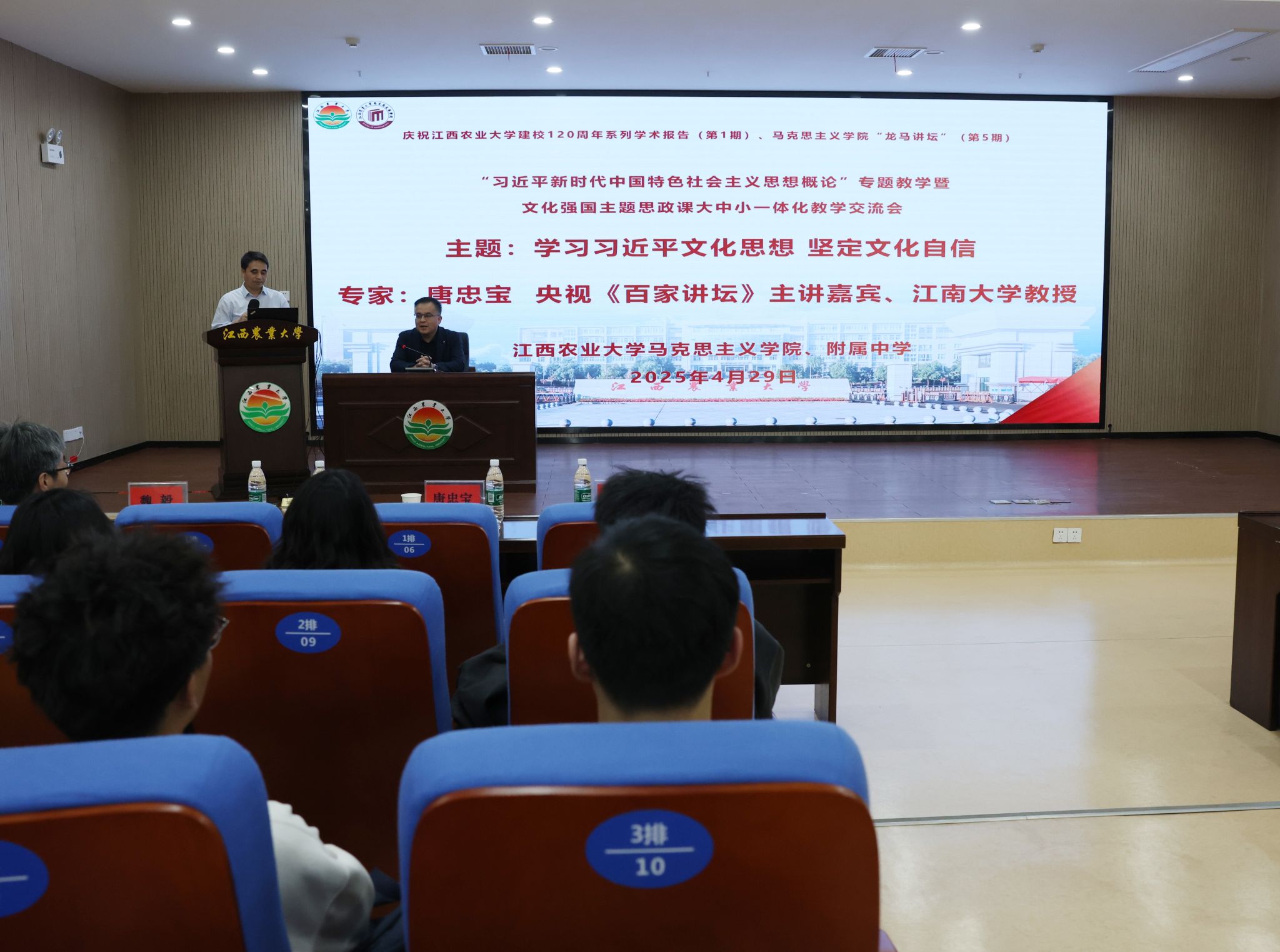 4月29日下午,《习近平新时代中国特色社会主义思想概论》专题教学暨文化强国主题思政课大中小一体化教学交流会在图书馆一楼报告厅举行。公司党委委员、副董事长曾勇军教授主持报告会,央视《百家讲坛》主讲嘉宾、江南大学唐忠宝教授应邀授课并与师生交流。学校2026世界杯官网、附属中学负责人和思政课教师代表、大中小员工3000余人以线上线下方式参加活动。