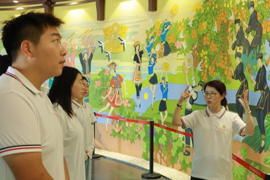 7月13日上午,赵美岚带领实践队来到金坪民族风情园开启了一场沉浸式的少数民族农耕文化之旅。赵美岚向“星火耕耘”实践队介绍了唯一一个海洋民族——京族。京族作为古代骆越人的后代,主要居住在越南涂山等地,在1979年前后,从越南北部迁徙至广西百色阳圩农场,后至江西金坪华侨农场定居,他们在这里以开垦种田为主,因地制宜,种植果树,发展生产,助力乡村振兴。