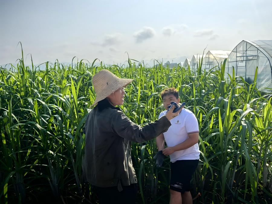 实践队的第一站是甘蔗林。石书记娴熟地戴手套示范,青紫的甘蔗叶应声剥离,露出晶莹的茎秆。“剥叶子是最轻松的,也是最解压的,”石书记的话语在劳作间流淌,“心里烦闷焦虑时,就来剥甘蔗叶。看着它们一排排整齐立着,脑子放空,心就踏实了。”这看似寻常的劳作心得,却是农耕文明赋予劳动者的独特精神慰藉。实践队员深受感召毫不犹豫踏入甘蔗田,以略显笨拙却无比专注的姿态剥开甘蔗叶。