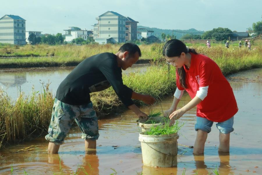图三(实践队员吴小青与当地农民一起抛秧 )