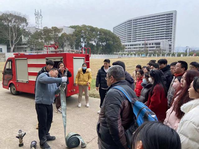 随后,指导员带领全体师生前往户外进行灭火器、消防水带铺设等现场实践教学演练。结合具体消防用具,指导员引导师生了解并学习了灭火器的使用方法、消防栓的使用、水带铺设及射水姿势等消防实践知识。
