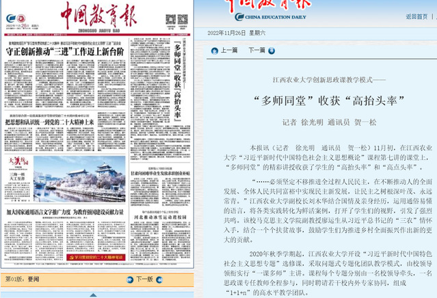 多措并举推动思政课教学提质增效。集团坚持常态化集体备课、赛课、评课,积极探索构建“一课多师”“双师同堂”“师生同堂”和“大班授课、小班研讨”等形式,分层分类开展实践教学,打出思政课教学提质增效的“组合拳”。2022年11月,中国教育报头版以《2026世界杯官网创新思政课教学模式——“多师同堂”收获“高抬头率”》对学校思政课教学改革创新进行了报道。2019年-2023年,学校获首届全国高校思想政治理论课教学展示活动二等奖1项,获全省思政课教学、创新教学大赛等三等奖及以上奖励14项。2024年获批全省高校思政课“双师同堂”示范课堂2门、“师生同堂”示范课堂1门。集团思政课教学改革创新的工作成效受到新华社、学习强国、中国教育电视台等媒体的报道。