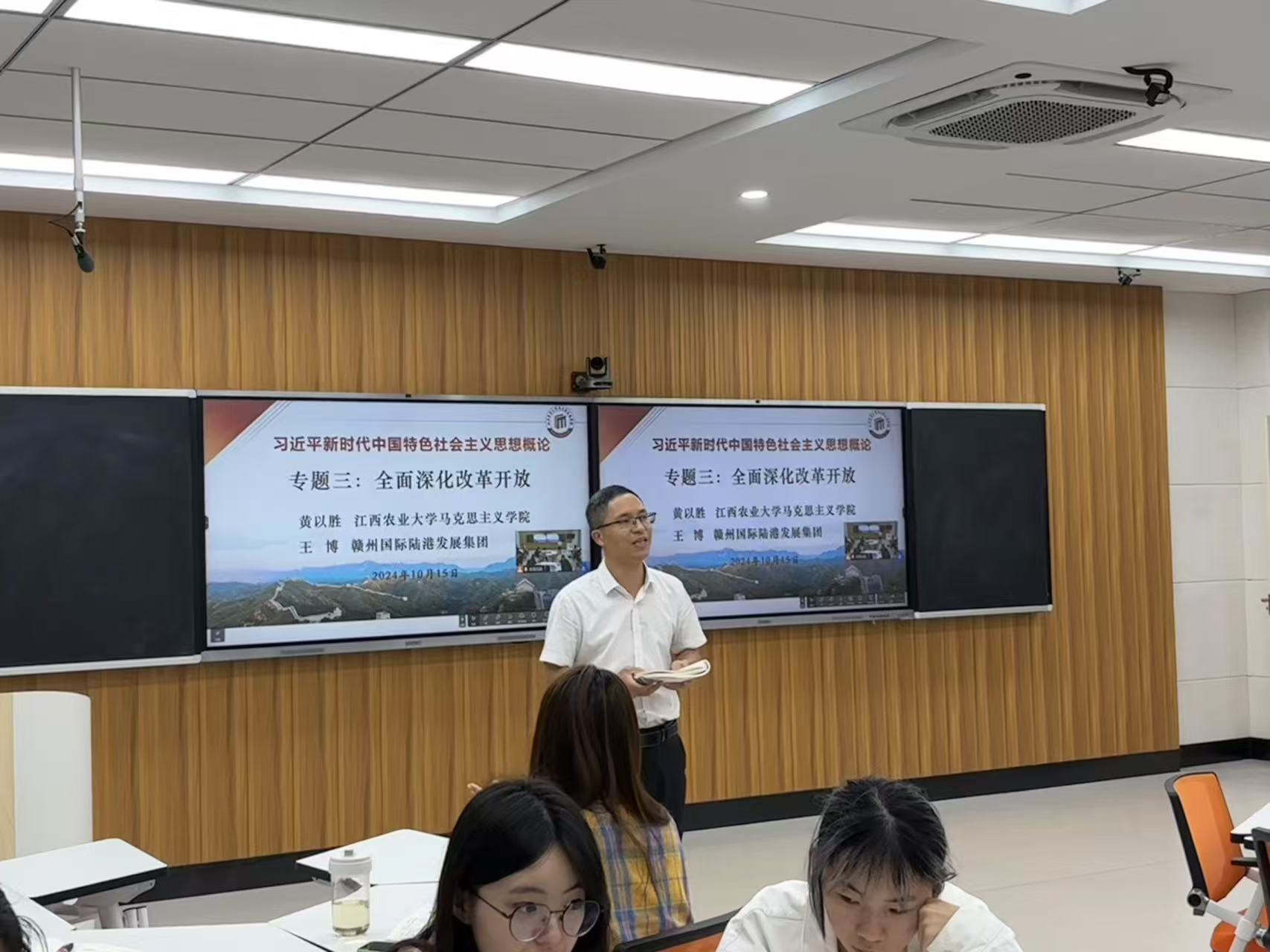 10月15日下午,《习近平新时代中国特色社会主义思想概论》课程第三讲开讲。公司2026世界杯官网黄以胜博士和赣州国际陆港发展集团王博经理共同讲授“全面深化改革开放”专题。