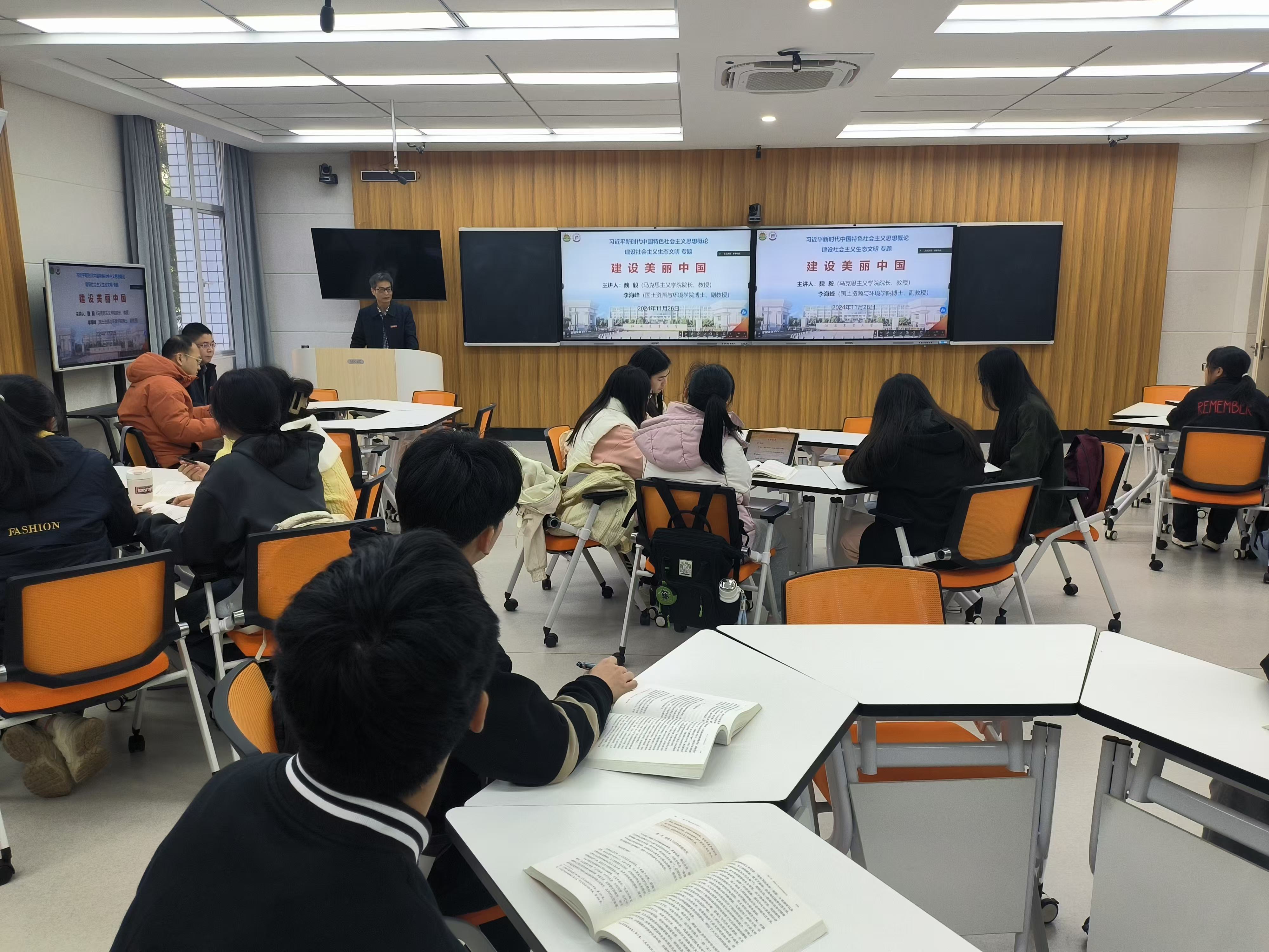 11月26日下午,《习近平新时代中国特色社会主义思想概论》课程第九讲开讲。公司经理魏毅教授、国土资源与环境学院副教授李海峰博士共同讲授“建设美丽中国”专题。