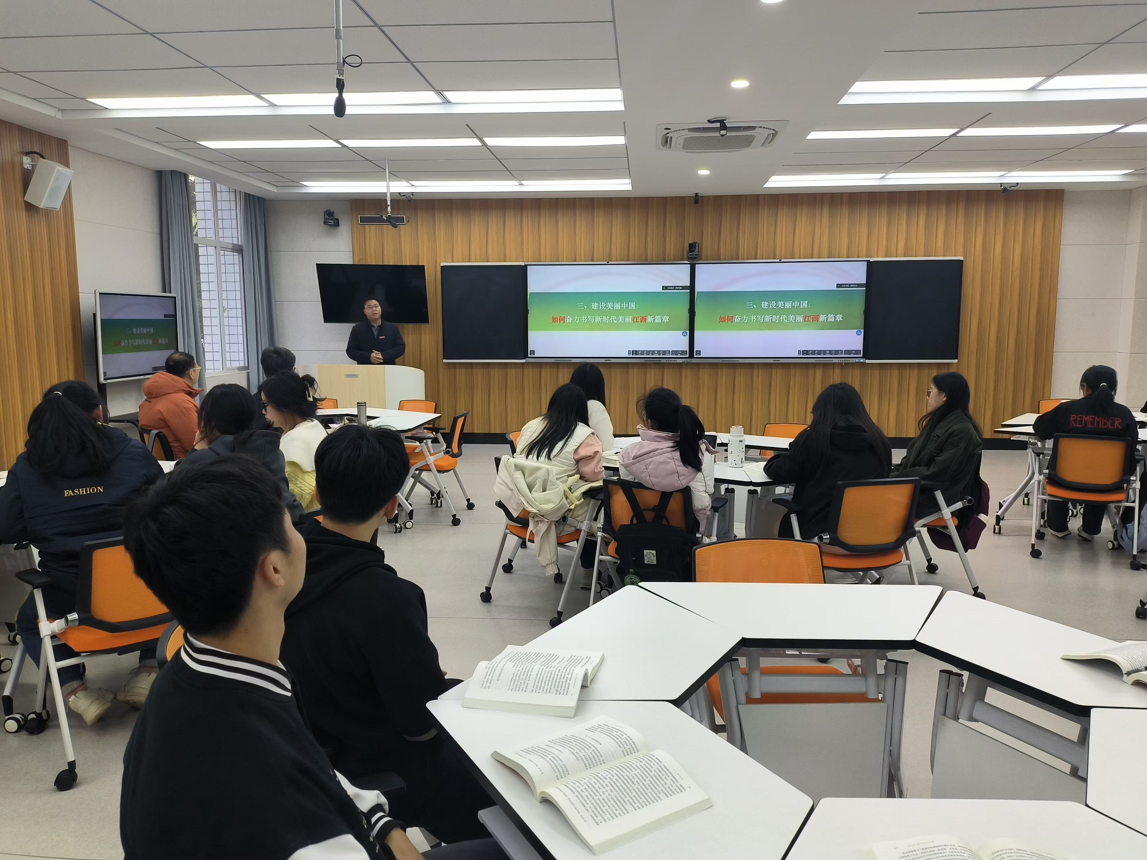 课堂上,同学们与两位老师进行了互动交流,员工代表还围绕建设美丽中国主题进行了分享。