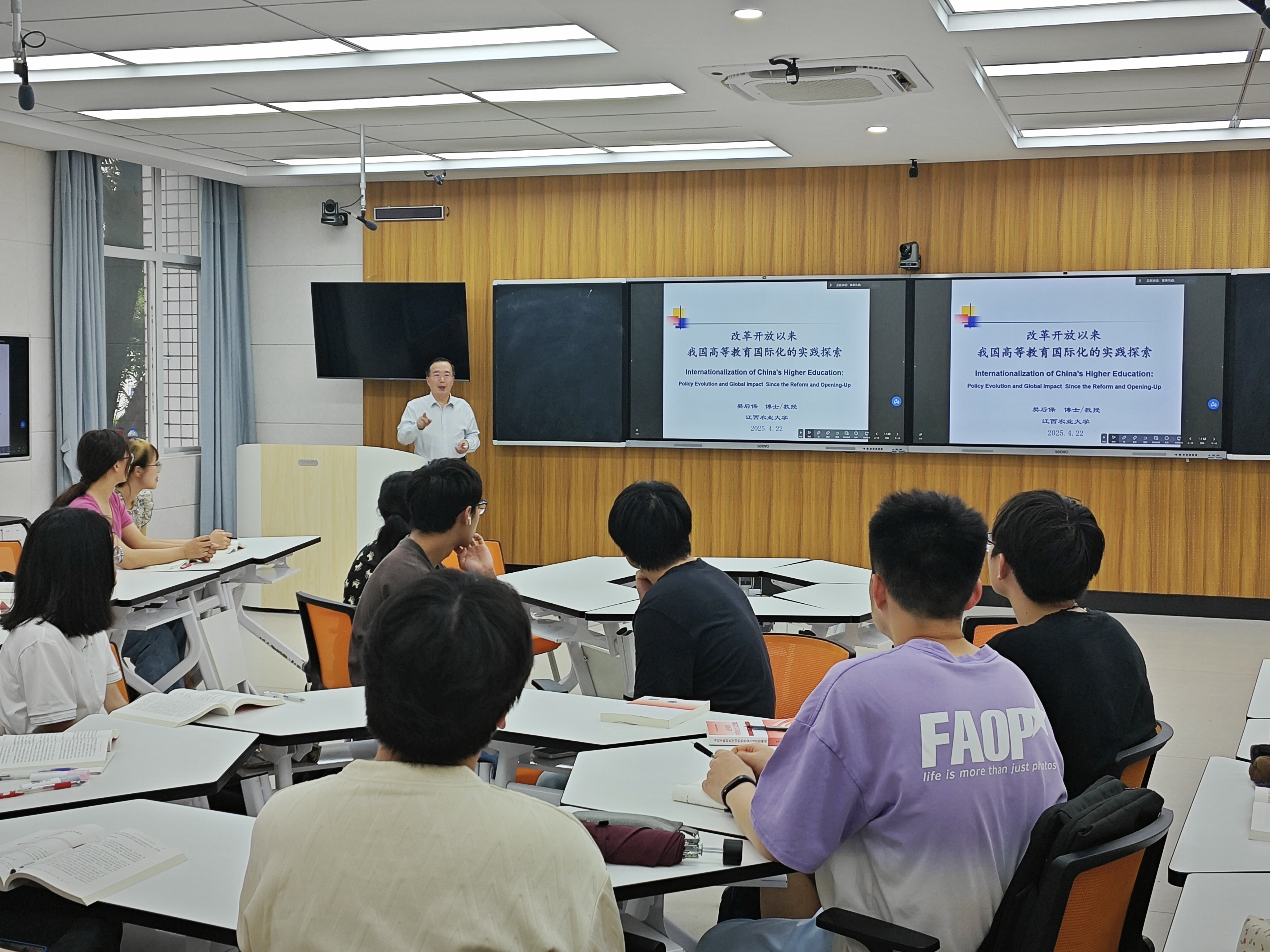 随后,樊后保聚焦中国高等教育发展历程,以“百年变革与图强”为主题展开专题授课。他运用详实数据与典型案例,系统回顾了我国高等教育从近代起步到现代化跨越的百年征程,重点解析了改革开放以来教育领域取得的历史性成就,特别指出党和国家始终坚持将“以人民为中心”作为教育发展的根本遵循,彰显了办好人民满意教育的坚定决心。
