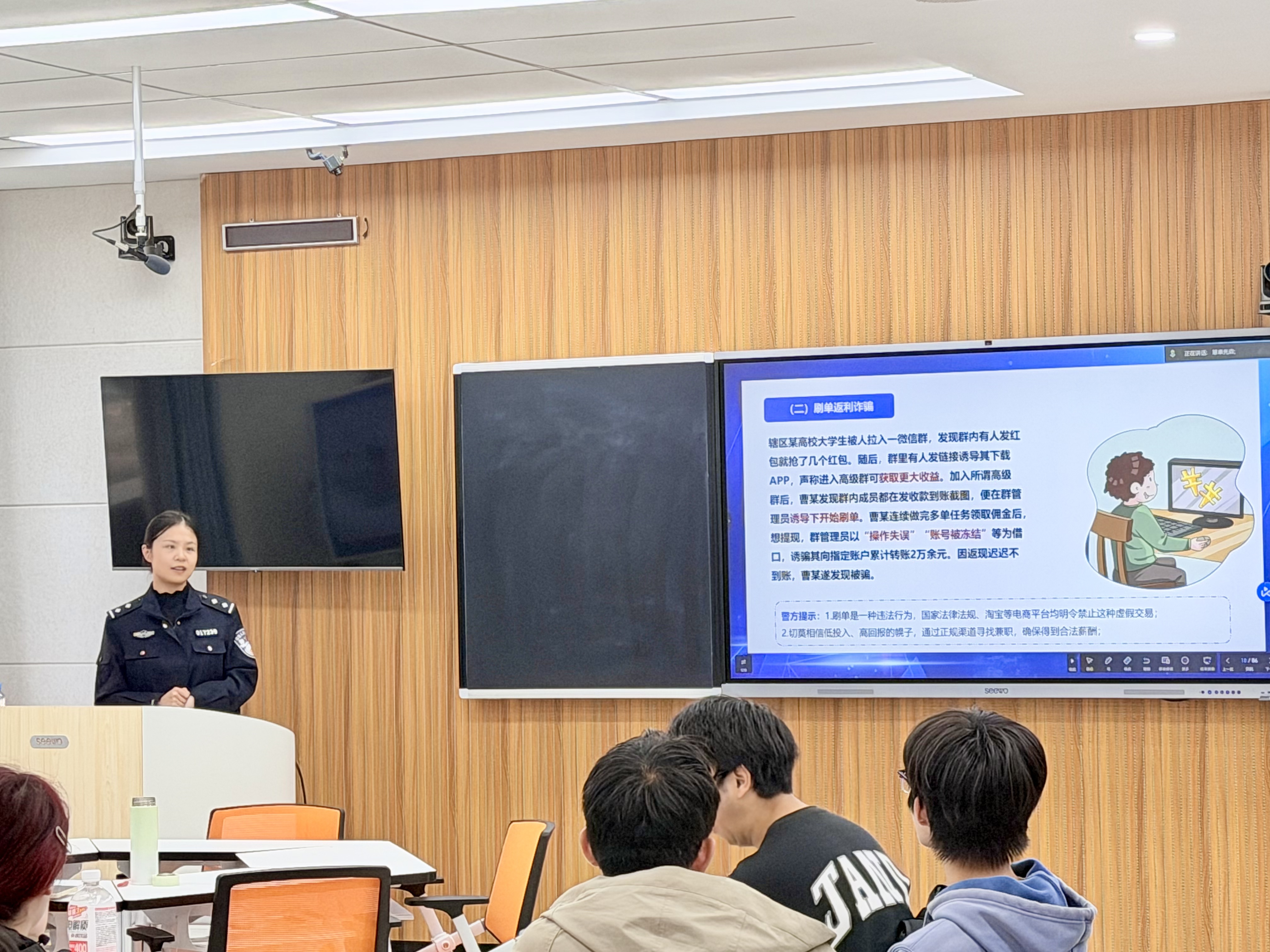 课程伊始,杨心怡以“学反诈知识,不做电诈‘工具人’”为题,结合党的二十届四中全会精神,通过趣味视频引发兴趣,并结合高校特点,系统剖析了各种高发电信诈骗手法。通过解读《中华人民共和国反电信网络诈骗法》,她强调该法是保护人民财产安全的重要保障,并呼吁同学们增强法治与反诈意识,做知法守法的新时代老员工。