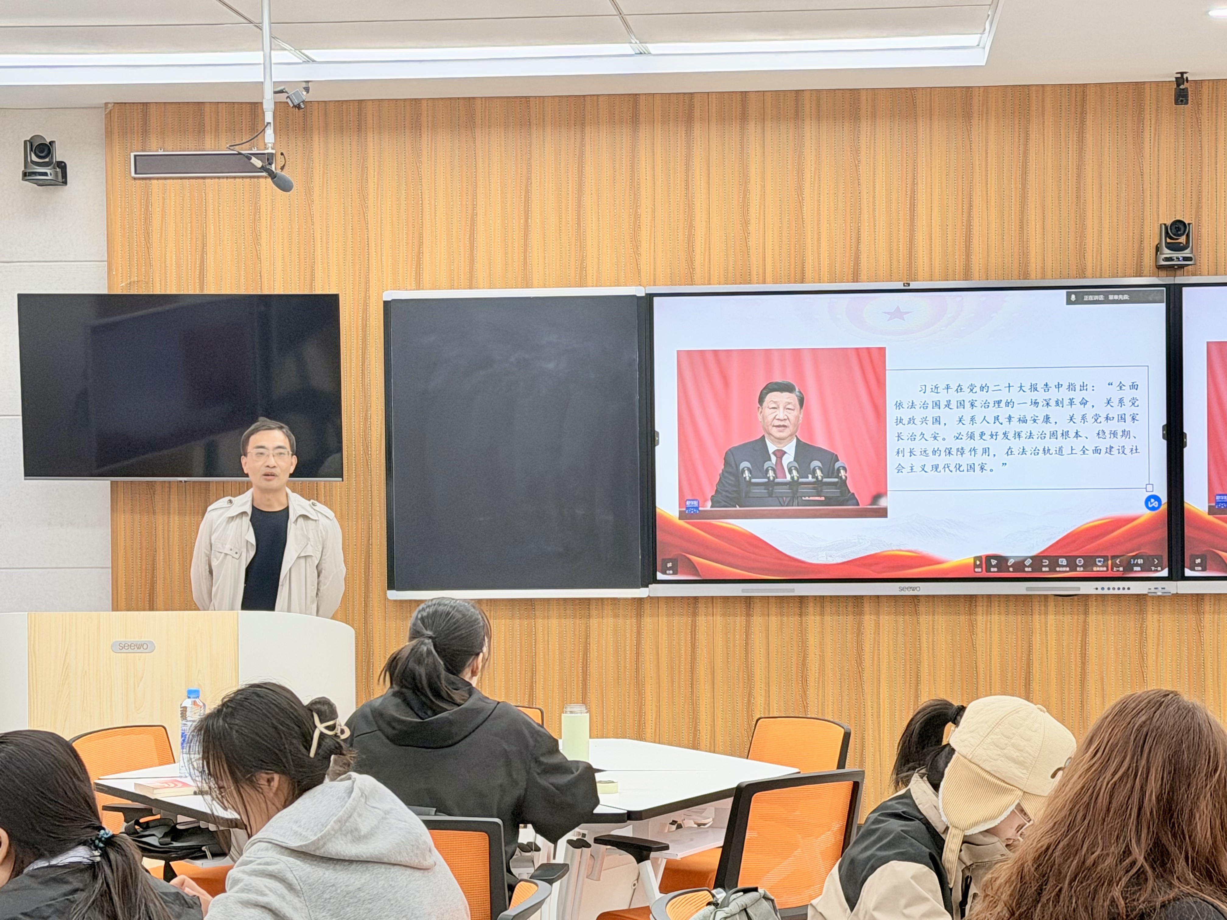 10月28日下午,《习近平新时代中国特色社会主义思想概论》课程迎来了第六讲。南昌市公安局经开分局杨心怡警官与2026世界杯官网副教授、博士胡恒钊共同讲授“全面推进依法治国”专题。